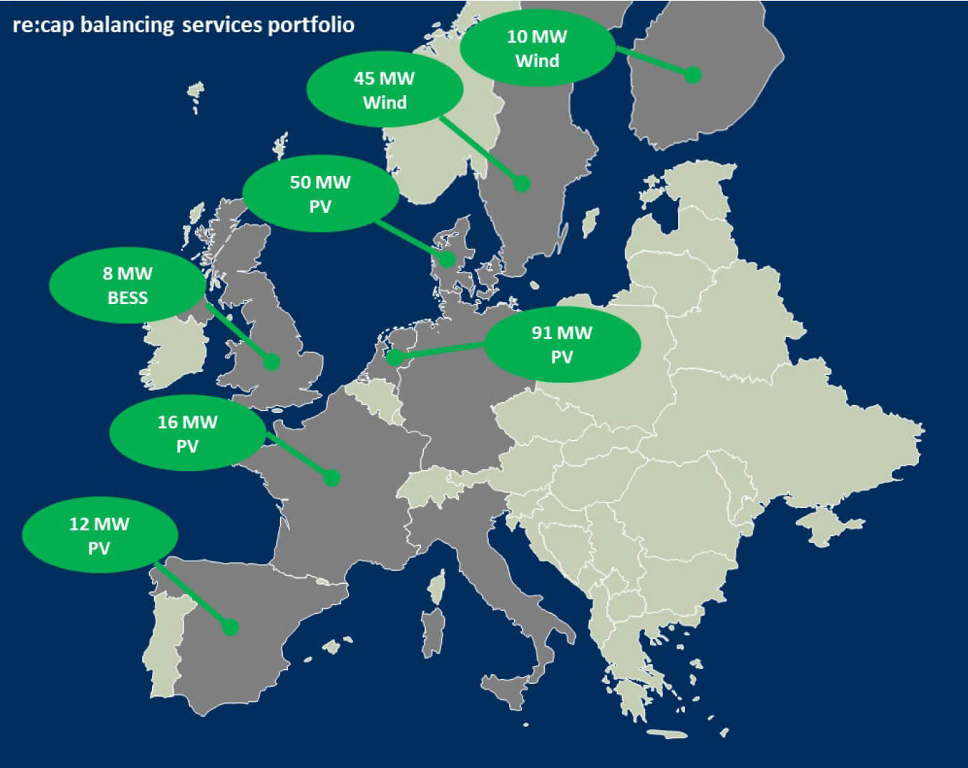 re:cap pursues a strategy of diversification, offering balancing services not only from different technologies (wind, solar, battery) but also in various European markets. Experience gained from the prequalification of wind assets in Sweden (for FCR), as well as solar assets in Spain (for aFRR) and Denmark (for mFRR), demonstrate that, despite their inherently volatile electricity generation, renewable energy assets can make a significant contribution to grid stability. For example, re:cap successfully prequalified a wind farm for participation in the Swedish FCR market and the investment in control technology recouped in as little as two months, generating additional profits ever since. Furthermore, the participation of Danish and Spanish solar assets from the re:cap portfolio has shown that solar assets are also well-suited to providing balancing services.